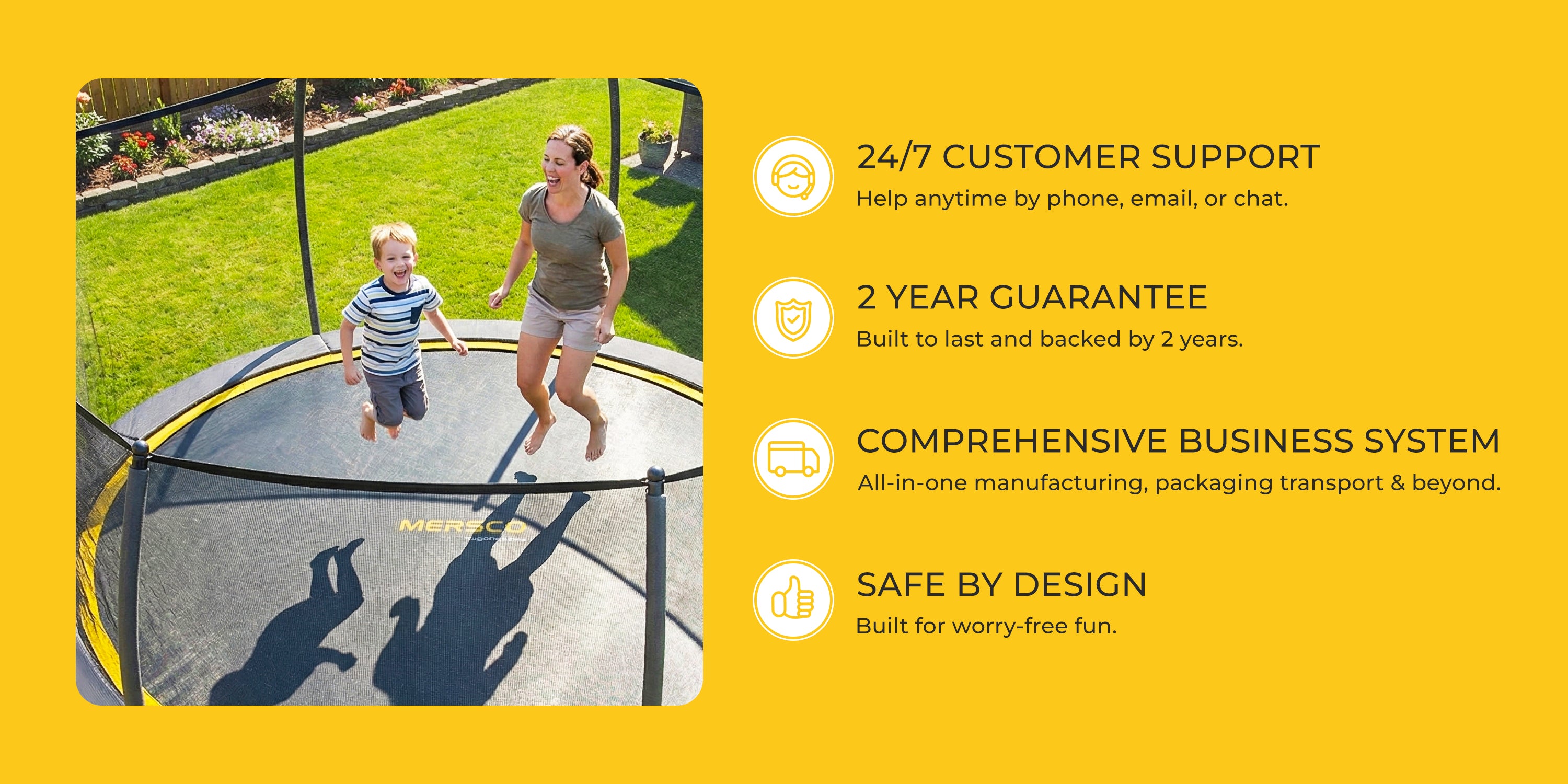 “MERSCO is a backyard-trampoline brand born from a mother’s love and professional expertise. Founded by a mom, we set out to compress the wide-open, safety-certified vibe of a commercial trampoline park into every family’s yard. After 15+ years of single-minded focus, our innovation-driven designs have redefined home fun, delivering park-grade bounce and becoming the trusted playmate of households worldwide.